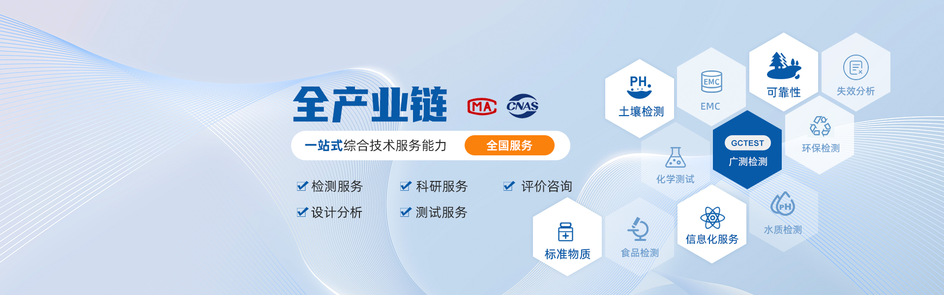 广测研究所拥有各种实验所需的高端仪器设备,并且拥有经验丰富的实验团队,为客户提供可靠的消毒产品、生物组织、半导体、冶金矿产、纺织品、化妆品等产品的标准检测服务,出具权威资质的检测报告,报告全国认可!